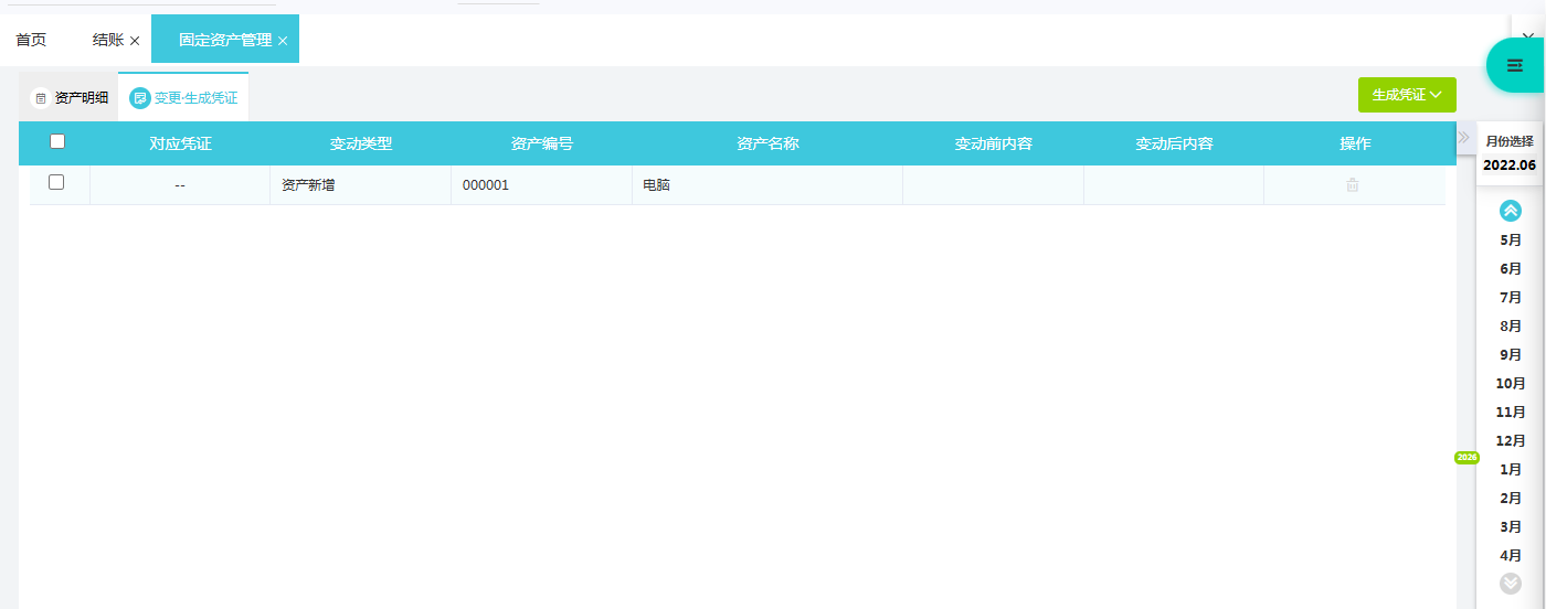 <p>点击“生成凭证”按钮,补全未生成的凭证,确保所有资产变动都有对应凭证后,再进行结账操作。</p><br>